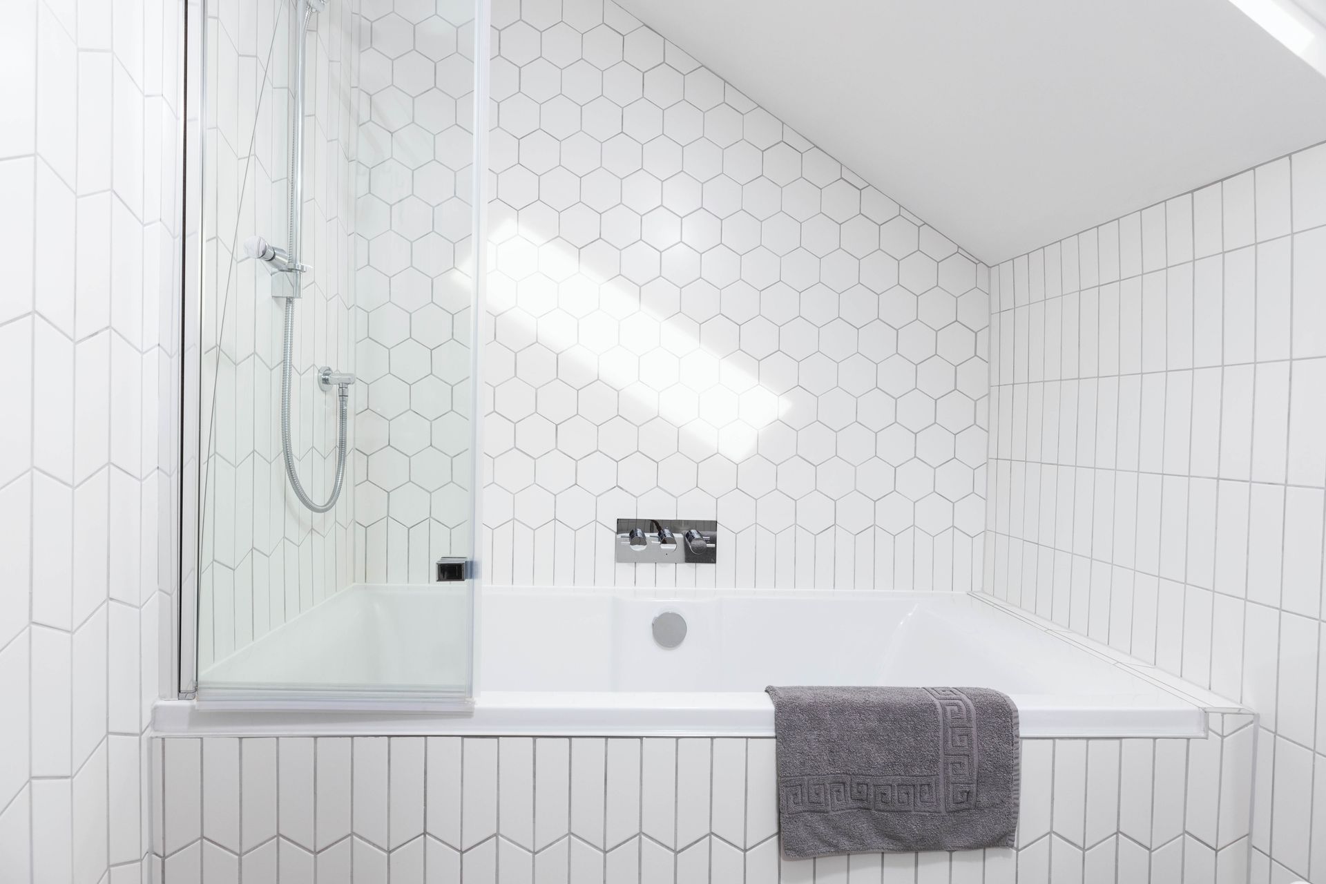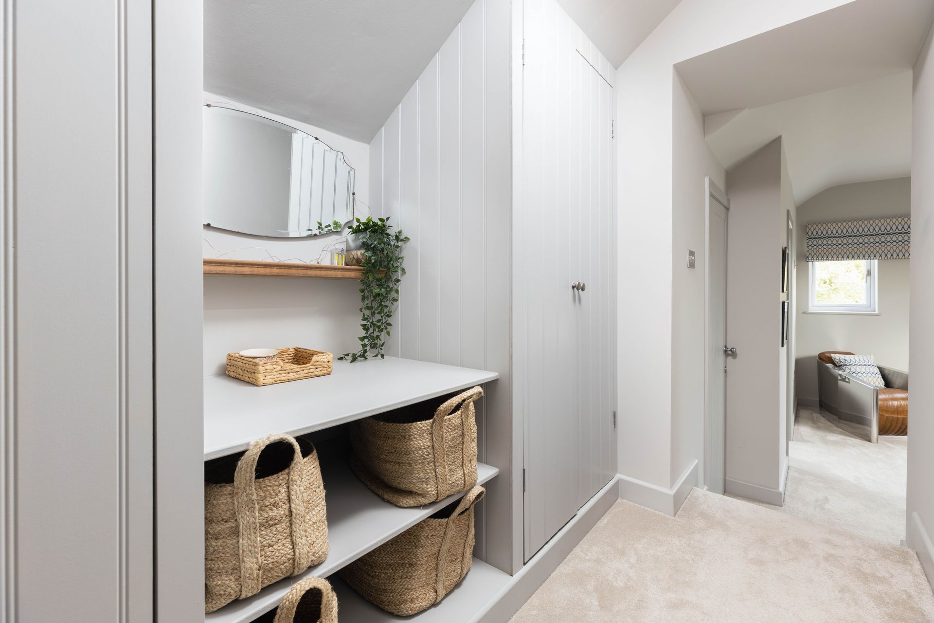 With the existing barn having the usual irregularly shaped walls, we utilised spaces with bespoke joinery cupboards/wardrobes and even a floating bed frame. To maximise space in the en suite, a pocket door system was installed to enable the space to still work with the sloped ceiling detail.