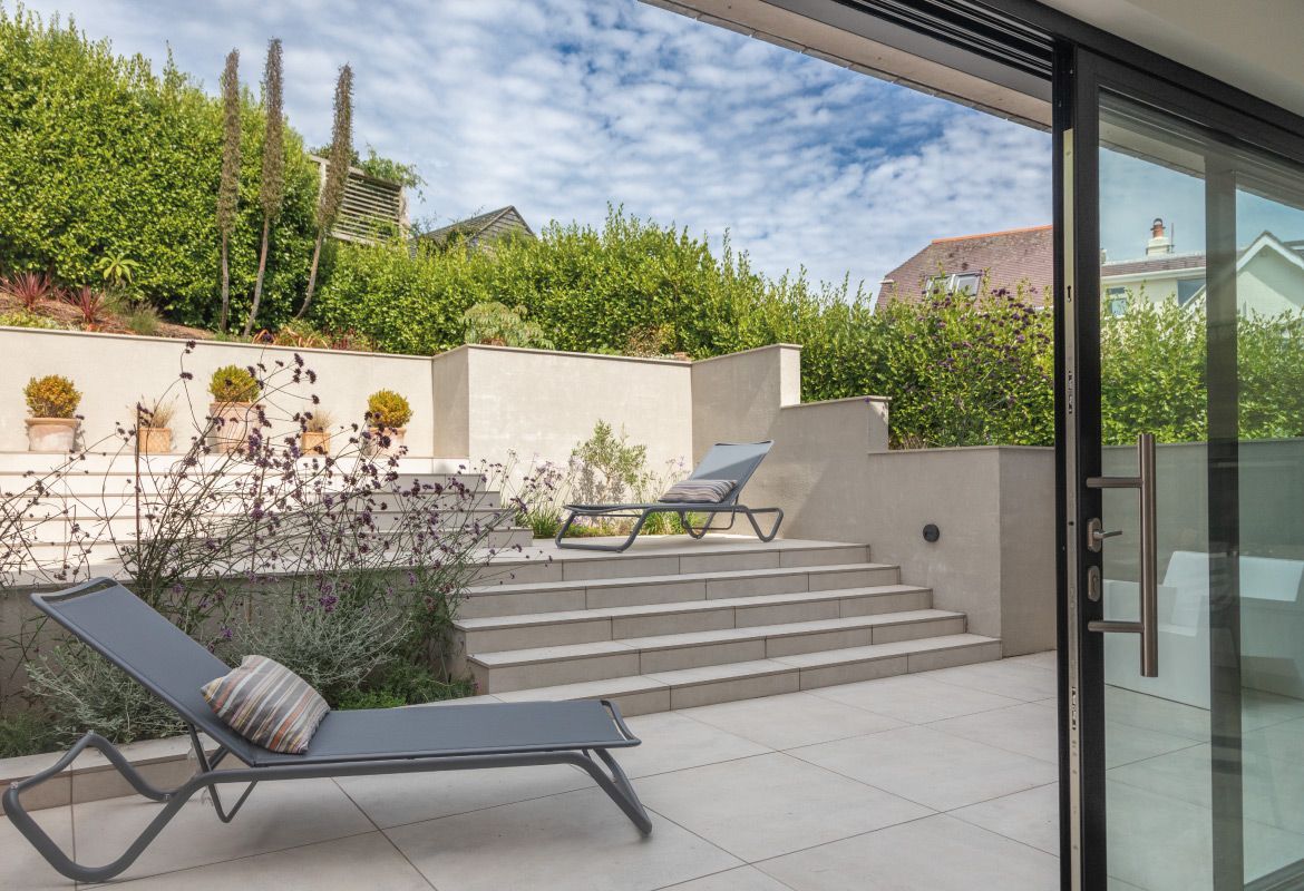 The landscaping was finished with 20mm porcelain paving throughout, polished concrete pads, and crushed limestone chippings.