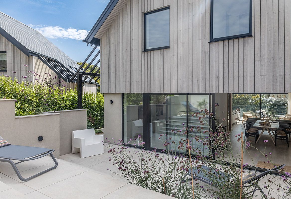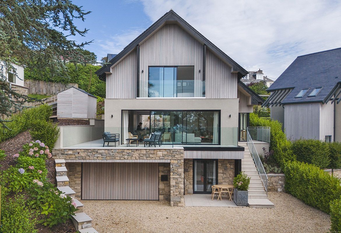The dwelling is clad externally with a natural Purbeck stone, Dryvit through colour render system, and clad with Si-ox-treated Siberian larch.